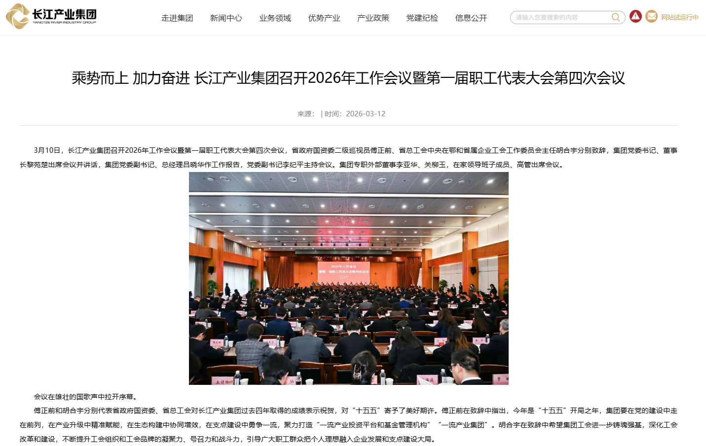 乘勢而上 加力奮進 長江產(chǎn)業(yè)集團召開2026年工作會議暨第一屆職工代表大會第四次會議 [2026/03/12]