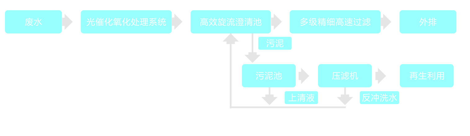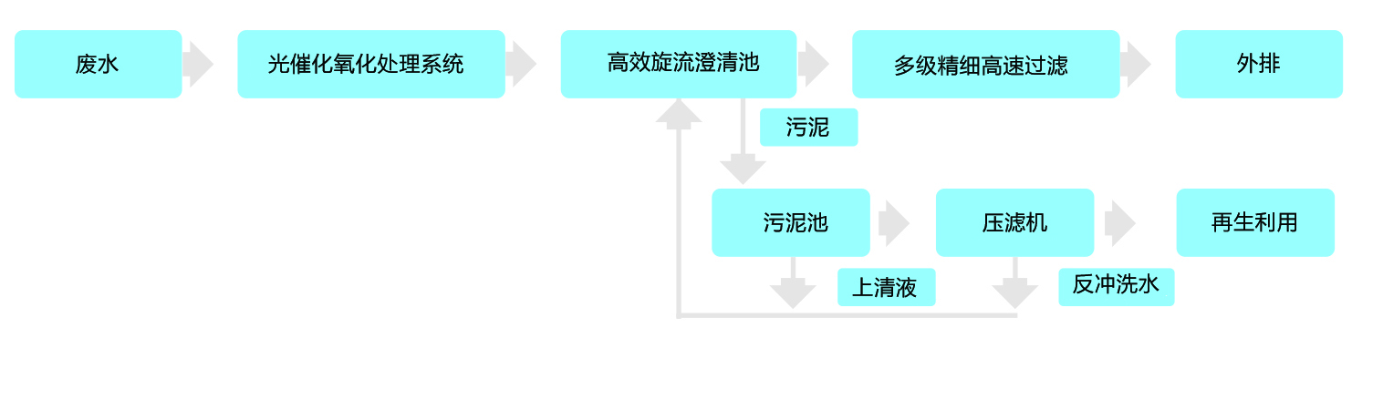 油田采油回注水進(jìn)入光催化氧化處理系統(tǒng),利用光催化改性陶瓷介質(zhì)作為載體,以可見光為光源,提高活性極強的羥基自由基的產(chǎn)率,通過羥基自由基與廢水中有機(jī)物的加成、取代、電子轉(zhuǎn)移等反應(yīng)使大部分有機(jī)污染物礦化為二氧化碳、水等簡單無機(jī)物。出水再進(jìn)入高效旋流澄清池,投加改性淀粉絮凝劑,使池中形成活性油渣層,強化廢水中細(xì)小油粒與活性油渣層內(nèi)較大油滴的接觸絮凝過程,從而高效除油。同時在裝置進(jìn)水區(qū)設(shè)計出獨特的喉管混合結(jié)構(gòu),使池中形成小而密實的絮凝體,提高旋流澄清池的絮凝效率。出水經(jīng)輻射式多級精細(xì)高速過濾器處理后可達(dá)標(biāo)外排。