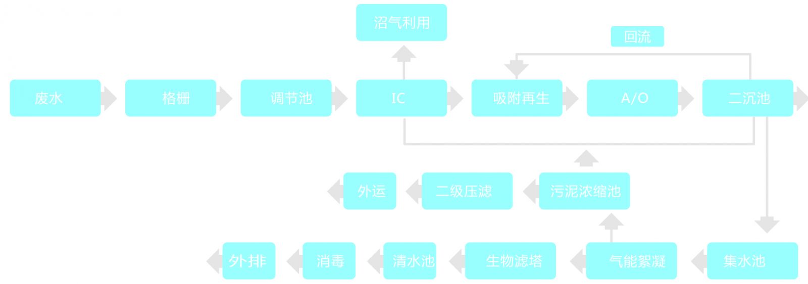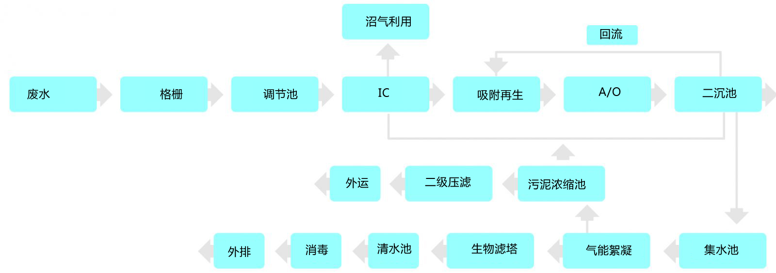 廢水經(jīng)格柵預(yù)處理,去除大的漂浮物質(zhì)后進入調(diào)節(jié)池勻和水質(zhì)水量,調(diào)節(jié)后的污水進入IC高效厭氧反應(yīng)器,廢水在反應(yīng)器中自下而上流動,有機污染物被高濃度的厭氧顆粒污泥吸附并降解,同時IC可以通過內(nèi)循環(huán)改善傳質(zhì)效果,并實現(xiàn)自動稀釋進水,不僅降低了有機物負荷,還能有效保證進水濃度的穩(wěn)定性,極大地提高對COD等有機污染物的處理效率。出水進入A/O反應(yīng)池,通過缺氧/好氧工段高效去除COD并實現(xiàn)脫氮功能。處理后的出水經(jīng)二沉池進行固液分離后,進入氣能絮凝系統(tǒng)進一步去除水中殘留的細小懸浮物。再由具備生物代謝與吸附過濾雙重功能的生物濾塔處理,出水消毒后即可達標(biāo)外排。