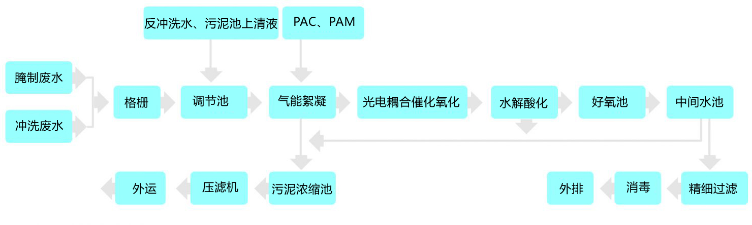 蔬菜腌制及車間沖洗廢水首先進(jìn)入格柵截留廢水中大的雜物后與各系統(tǒng)反沖洗水、污泥濃縮池的上清液匯合后進(jìn)入調(diào)節(jié)池,進(jìn)行水量和水質(zhì)調(diào)節(jié),并通過厭氧作用去除部分COD后進(jìn)入氣能絮凝系統(tǒng),通過投加絮凝劑進(jìn)一步去除污水中絕大部分懸浮態(tài)的無機(jī)及有機(jī)雜質(zhì),出水進(jìn)入光電耦合催化氧化反應(yīng)器,通過電解降低廢水中所含的高鹽成分,提高活性極強(qiáng)的羥基自由基的產(chǎn)率,通過加成、取代、電子轉(zhuǎn)移等反應(yīng),將廢水中大部分有機(jī)污染物轉(zhuǎn)化為簡單無機(jī)物。出水經(jīng)過水解酸化后進(jìn)入好氧池,進(jìn)一步去除COD、氨氮等各類污染物,再經(jīng)多級(jí)精細(xì)過濾、消毒后達(dá)標(biāo)排放。
