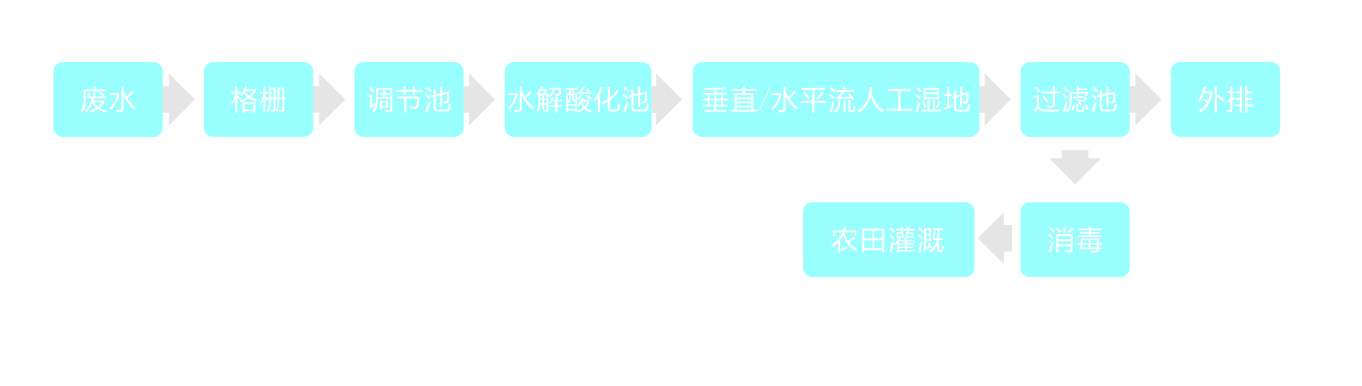 廢水經(jīng)格柵和調(diào)節(jié)池預(yù)處理后,進(jìn)入水解酸化池,污水中有機(jī)物通過附著在池內(nèi)填料中微生物膜的分解得到初步降解,固體懸浮物被沉降去除,有機(jī)物由大分子被分解成小分子而提高其可生化性。出水通過配水管網(wǎng)進(jìn)入垂直/水平流人工濕地系統(tǒng)的各個單元,利用土壤、人工介質(zhì)、植物、微生物的物理、化學(xué)、生物三重協(xié)同作用,其機(jī)理包括吸附、滯留、過濾、氧化還原、沉淀、微生物分解、轉(zhuǎn)化、各類植物對污水中營養(yǎng)源的吸收等,以實(shí)現(xiàn)去除污水中COD、BOD、氮磷等各種污染物的目標(biāo),人工濕地系統(tǒng)出水由過渡池外排或消毒后用于景觀澆灑、沖洗道路、灌溉農(nóng)田等。