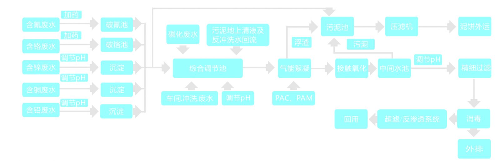 含氰、含鉻廢水投加特種還原劑后分別進入破氰池與破鉻池,含鋅、含鉛、含銅、含鎘等廢水調(diào)pH后經(jīng)過沉降,上清液與磷化廢水混合后進入綜合調(diào)節(jié)池,經(jīng)調(diào)節(jié)pH后進入氣能絮凝系統(tǒng),高效去除廢水中懸浮物后進入接觸氧化池,通過生物膜作用去除廢水中COD等有機污染物,出水經(jīng)由中間水池沉淀,上清液經(jīng)精細過濾排至消毒池,通過消毒處理后達標外排;或經(jīng)超濾/反滲透系統(tǒng)處理后回用。